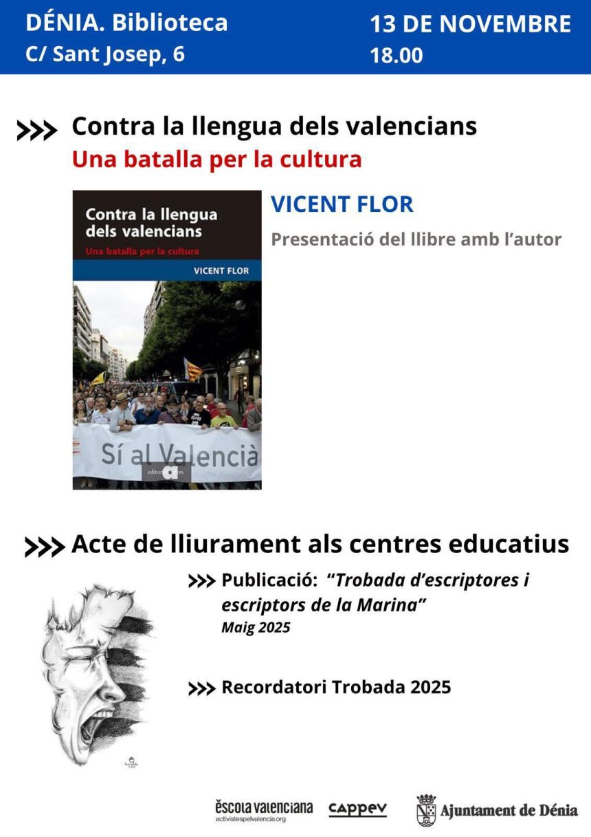 L’acte s’iniciarà amb la presentació del llibre “Contra la llengua dels valencians. Una batalla per la cultura” de Vicent Flor. (Entrada lliure fins a completar l’aforament)